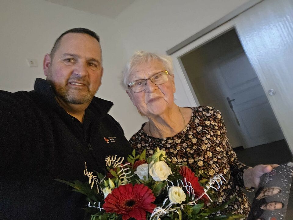 Kurz vor Weihnachten durfte der DRK-Mitarbeiter Silvio Wiegand der Hausnotruf-Teilnehmerin Frau Rimbach herzlich zum 100. Geburtstag gratulieren.